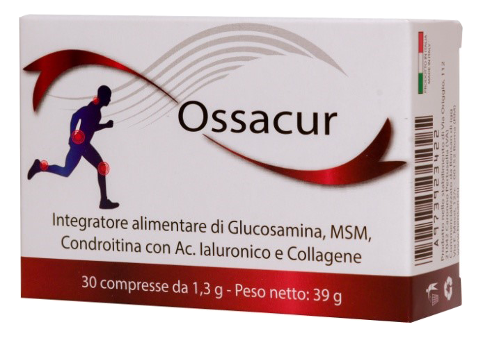 Indicazioni: OSSACUR è un integratore alimentare a base di Glucosamina, Condroitina, MSM (metilsulfonilmetano), Acido ialuronico e Collagene; costituenti del tessuto cartilagineo articolare. I componenti di OSSACUR sono utilizzati per mantenere la fisiologica funzionalità delle cartilagini ossee e sono in grado di colmare le carenze nutrizionali o l'aumentato fabbisogno giornaliero di tali nutrienti.